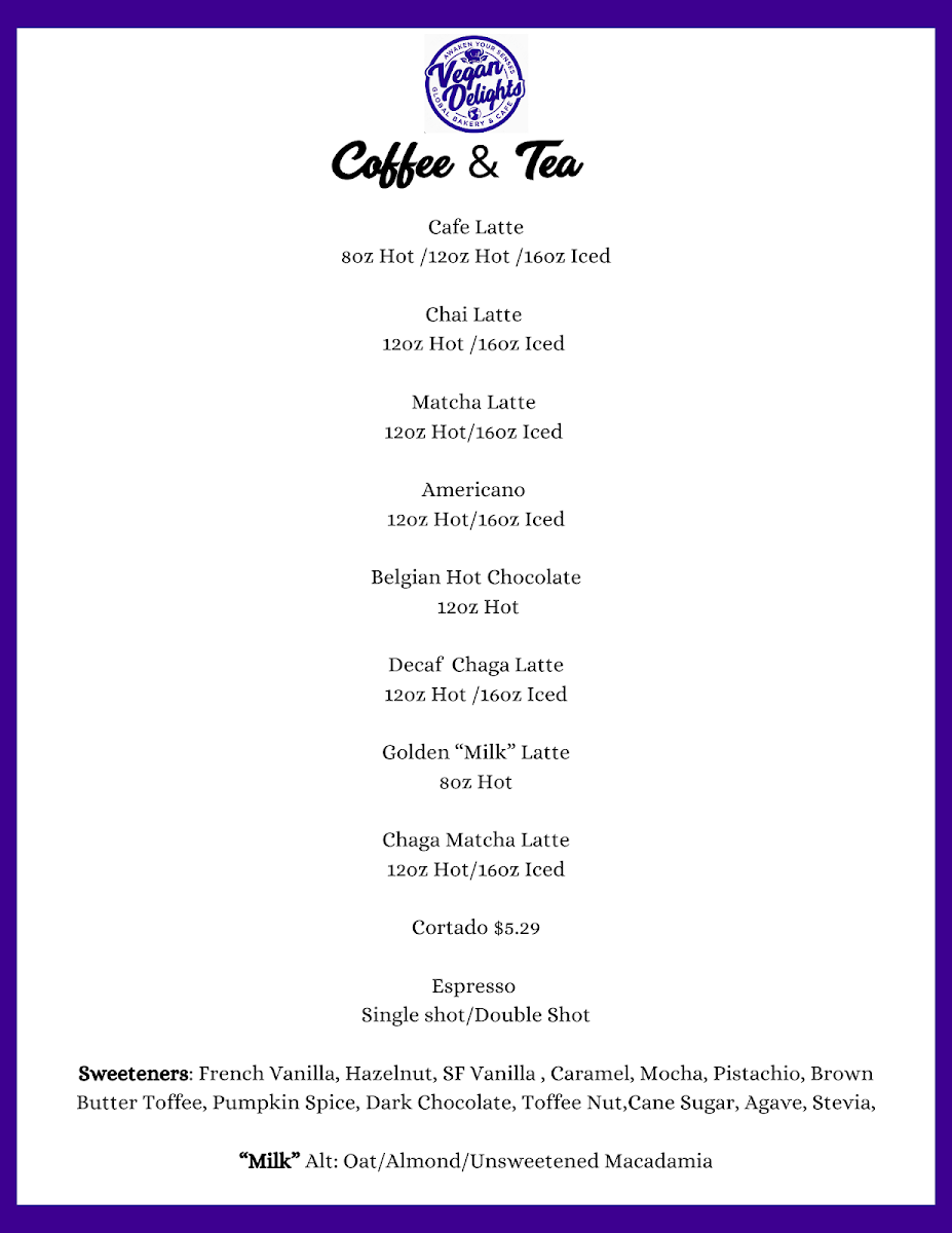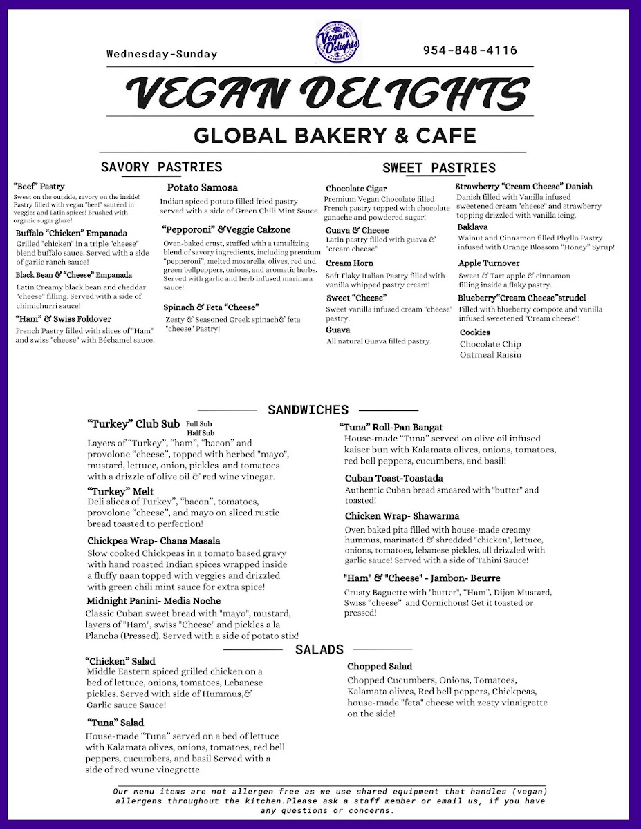 From a reviewer’s perspective, the menu at Vegan Delights in Fort Lauderdale offers a creative and satisfying variety, with standout options across several categories that make it easy to find something flavorful and plant-based. The Toastada, Zen Garden Wrap, Media Noche "Turkey" Melt, and "Tuna" Roll- Pan Bagnat in the sandwich and wrap section are hearty and well-crafted, while snack lovers will enjoy the Jalapeno- Kettle Chips, BBQ- Kettle Chips, Sea Salt & Vinegar- Kettle Chips, Mushroom Jerky- Teriyaki, and Asha Pops. For something more filling, the lunch combos like the Indian Trio, American Trio, Latin Trio, French Trio, and Mediterranean Trio offer great variety and value. The savory pastries, especially the Black Bean & "Cheese" Empanada W/Chimichurri Sauce, Buffalo "Chicken" Empanada W/Garlic Ranch Sauce, and "Pepperoni" & Veggie Pizzetta, are particularly memorable, and the drink menu pairs well with items like the Espresso-Double Shot, Hot Chocolate- 8 Oz Hot, Chaga Matcha- Hot Or Iced, and Americano- Hot Or Iced. Fresh options such as the Chopped Salad- Horitaki, "Tuna" Salad, and "Chicken" Shawarma Salad balance the menu nicely, while sweet treats like the Pumpkin Scone, Palmiers, and Strawberry Cream "Cheese" Danish provide a perfect finish. Overall, the menu is diverse, flavorful, and thoughtfully curated, making Vegan Delights a great spot for both quick bites and satisfying meals.